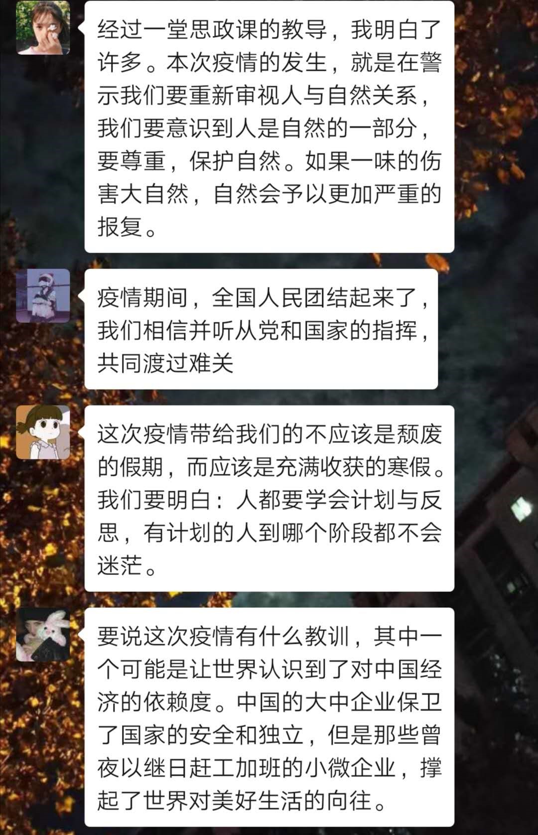 全班同学20人积极观看了今天的疫情防控思政大课,结束之后同学们在班级微信群进行了讨论,大家对自己身为一个中国人而感到荣幸。疫情当前,人人有责。我们对前线抗击疫情的广大一线医疗人员表示崇高的敬意,为抗击疫情过程中牺牲的无数仁人志士表达哀思,对有理想、有担当的青年们效法学习。疫情期间,我们要以大局为重,承担起一个大学生的责任。待在家里,听从国家安排不外出,不闲逛。在家关注疫情动态,给家人宣传知识,让他们不外出。这是考验中华民族的决胜时刻,我们要严格听从组织安排。同时,学习生活也不能懈怠,我们更应该严格要求自己,练就过硬本领,我也希望我以后能够成为一名新时代的造福人民的好同志,为社会的发展作出贡献!
