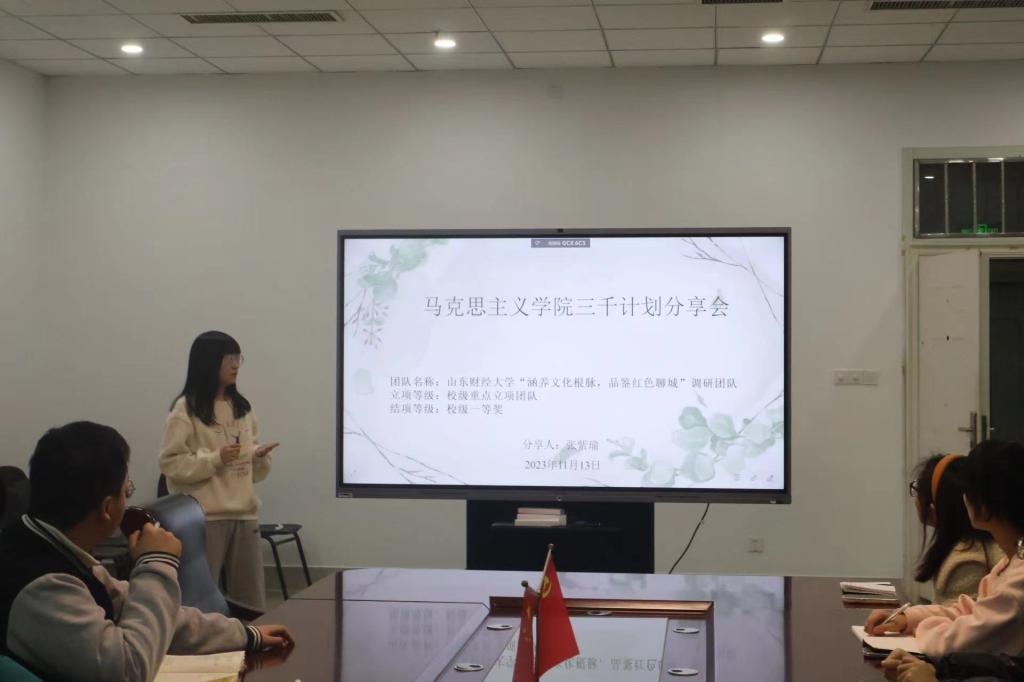 随后,“涵养文化根脉,品鉴红色聊城”调研团队队长张紫瑜从准备阶段、实施阶段、调研成果和注意事项等四个方面展开了介绍。张紫瑜表示选题应当精准把握社会痛点,既要“新颖”,亦要“聚焦”,建议同学们在实践过程中协调好时间,既要注重效率,也要注意安全。张紫瑜提出结项并不是项目的终点,要注重成果转化,多尝试、多历练,学在途中,乐在其中。