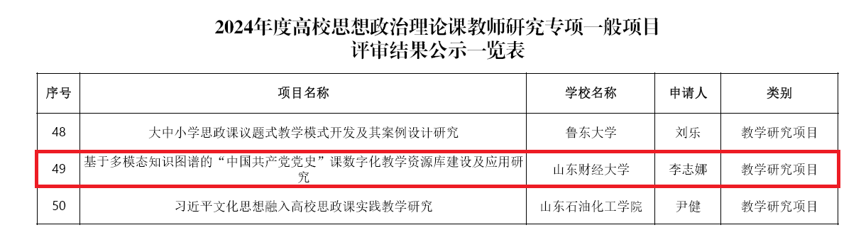 近日,教育部社会科学司对2024年度高校思想政治理论课教师研究专项一般项目评审结果进行了公示。本年度共评选出立项项目200项,其中教学研究项目101项、教学方法改革择优推广项目10项、优秀中青年思政课教师择优资助项目30项、教学研究青年项目59项。色情片 李志娜老师的《基于多模态知识图谱的“中国共产党党史”课数字化教学资源库建设及应用研究》获批教学研究项目。
