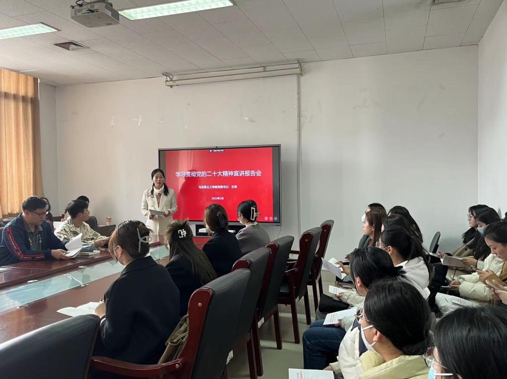 为深入学习贯彻党的二十大精神,推动党的二十大精神深入校园、深入师生头脑,3月23日下午,色情片 于学院606会议室举办学习贯彻党的二十大精神宣讲报告会,此次报告会特邀院党委书记石伟主讲,党委副书记王昊天和学院部分师生参加。